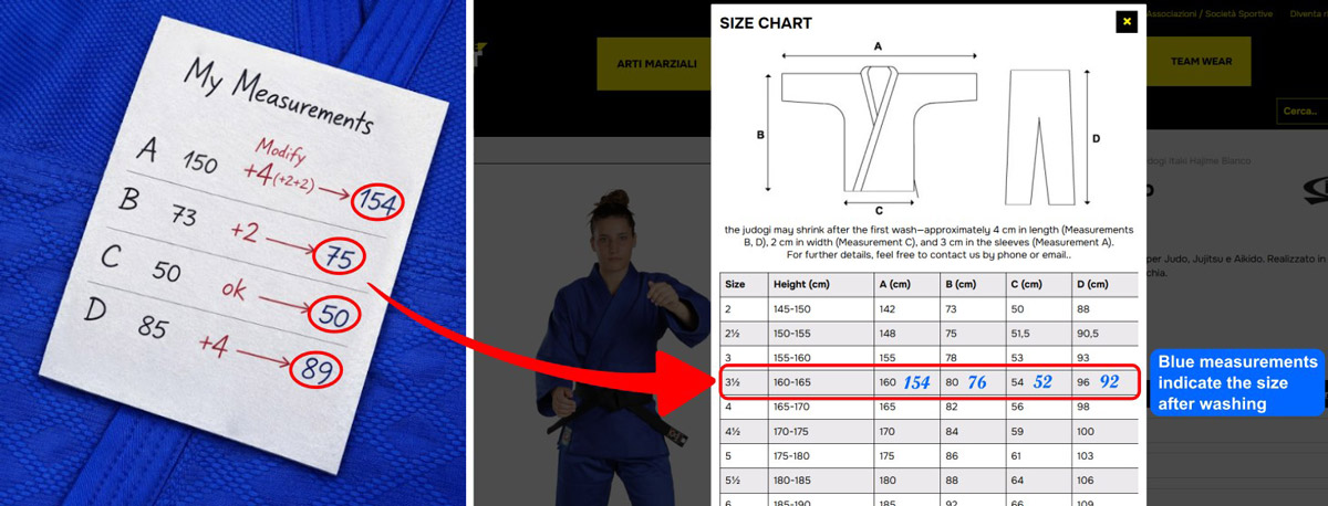 For example, a 100% polyester karategi does not shrink, whereas garments containing cotton shrinks, and this should be considered when comparing measurements. This aspect is always indicated in the size chart of each product, so that you can assess the correct size also according to the fabric composition.