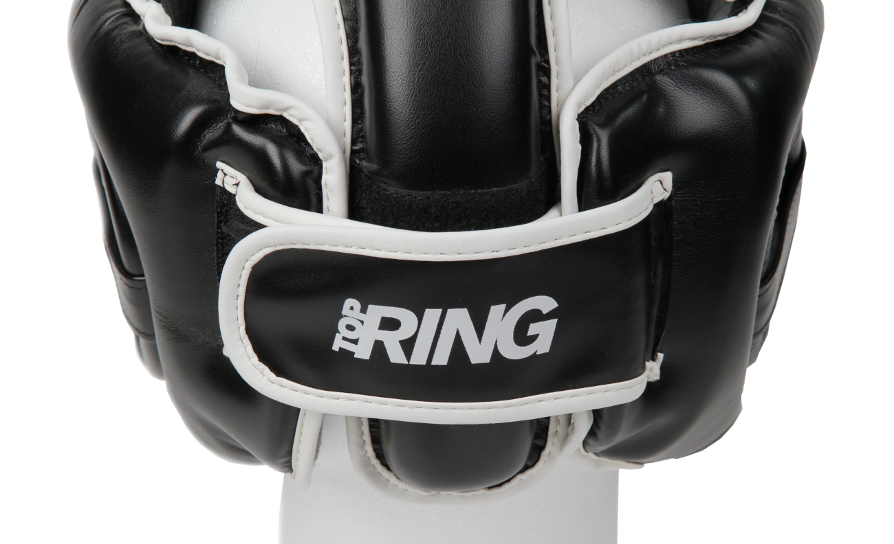 Top Ring Elite Head Guard with resistant microfibre lining and suede interior. Equipped with adjustable velcro closure. Pre-shaped padding to better absorb impacts.