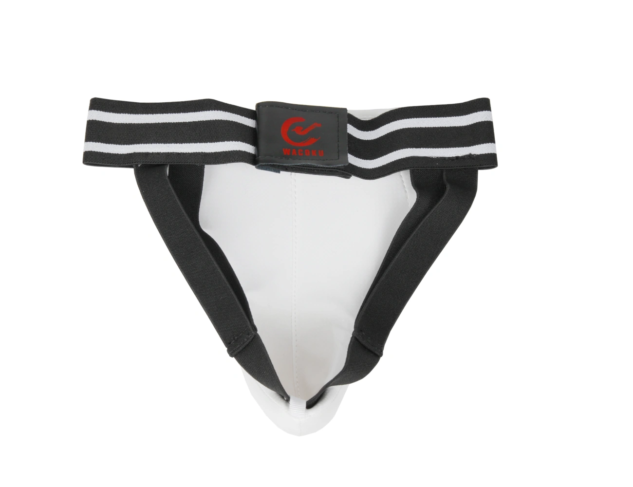 Wacoku groin guard with protection for genitals and lower abdomen, covered in soft polyurethane. Equipped with elastic with velcro closure for a stable and secure fit.