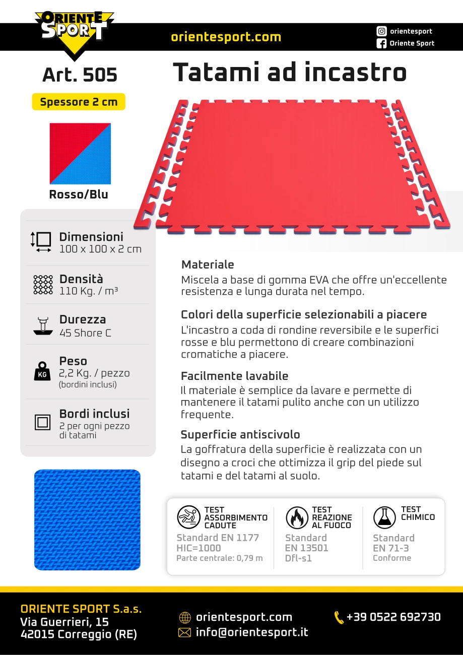 Tests: The tatami has been tested for impact absorption according to EN 1177, achieving an HIC=1000 result in the central area at 0.79 m. For fire reaction, the test carried out according to EN 13501 resulted in a Dfl-s1 classification. From a chemical point of view, the product complies with EN 71-3.