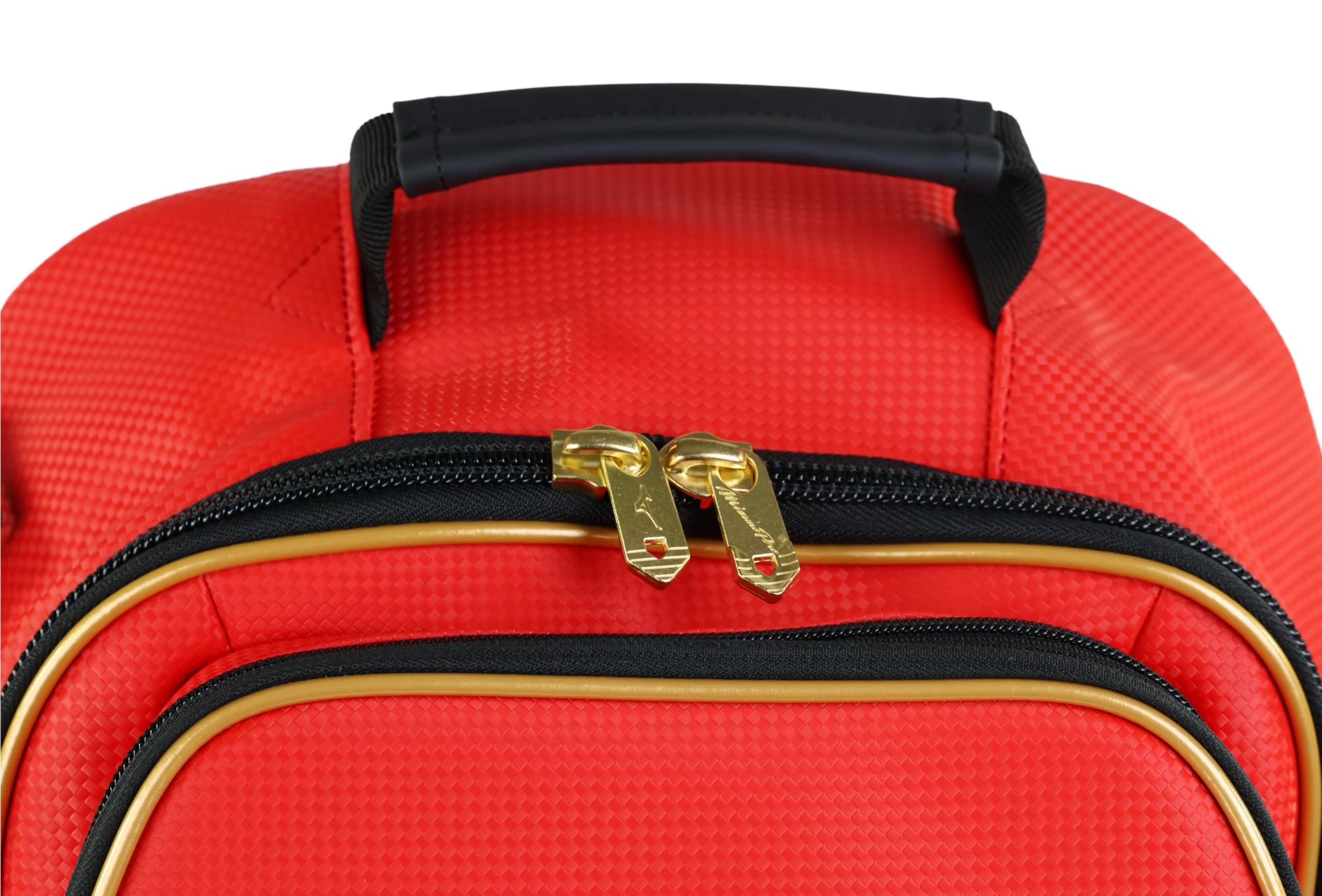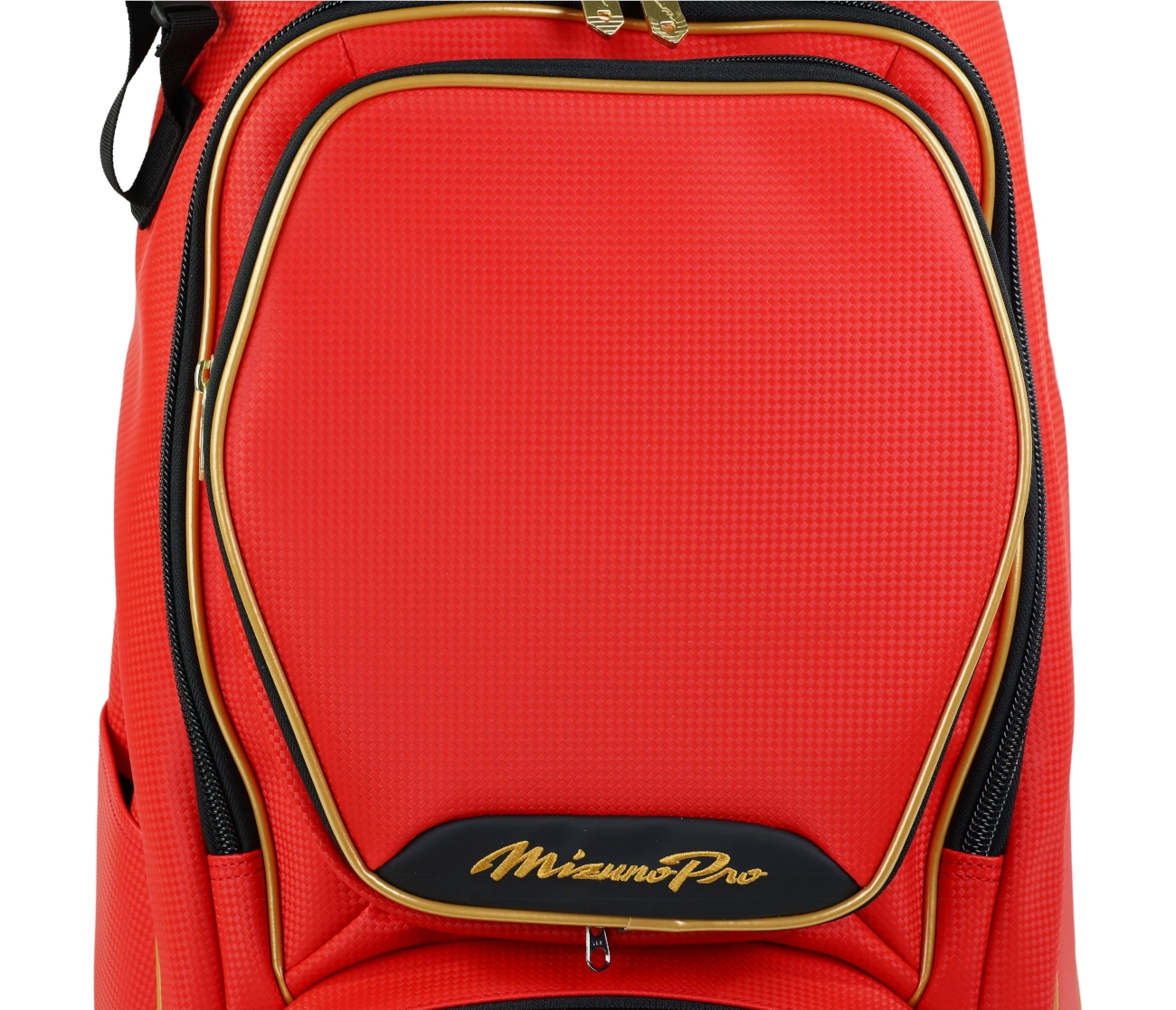 Details: Spacious main compartment with double zipper, plus front and side zip pockets for neatly storing accessories, shoes, or clothing. The gold Mizuno logo and contrast stitching enhance its refined, professional look.