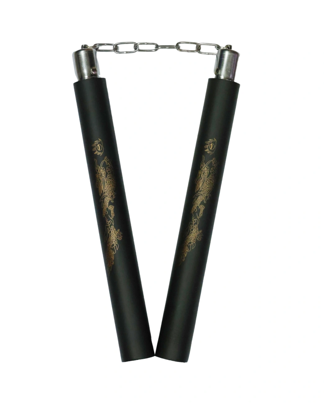 Design: This model has a round section and is made up of two kons, each 28-30 cm long, connected by a 20 cm chain with joints. The total weight of the nunchaku is 170 grams and is black in color, with a golden dragon printed to embellish it.