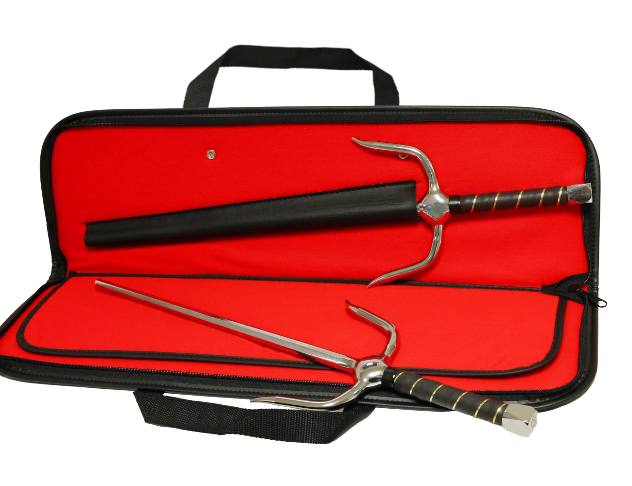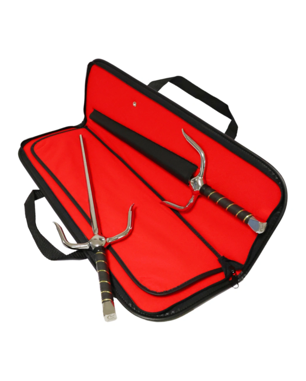 Design: La custodia Sai è realizzata in similpelle nera, che conferisce al prodotto un aspetto elegante. Il rivestimento interno morbido di colore rosso protegge i sai da eventuali graffi o danni durante il trasporto. Gli appositi inserti in ecopelle garantiscono un alloggiamento sicuro e stabile per i sai, mantenendoli al sicuro e ben posizionati. La chiusura con cerniera assicura una facile apertura e chiusura della custodia, consentendo un accesso rapido e comodo agli strumenti. Le impugnature per il trasporto rendono la custodia Sai comoda da portare ovunque, senza sacrificare stile e funzionalità.
