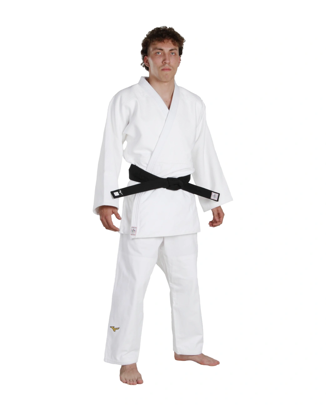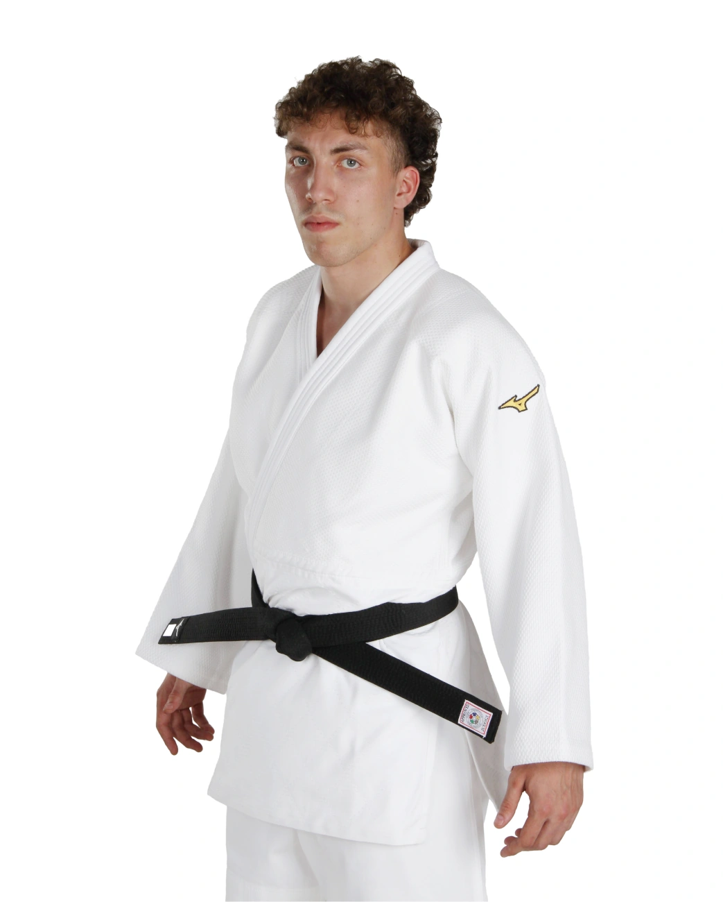 Judogi Mizuno Yusho Bianco di alto livello per atleti agonisti. Realizzato in cotone e poliestere con peso di 750 g/m². Ricamo Runbird in oro su spalla e pantalone. Omologato IJF.