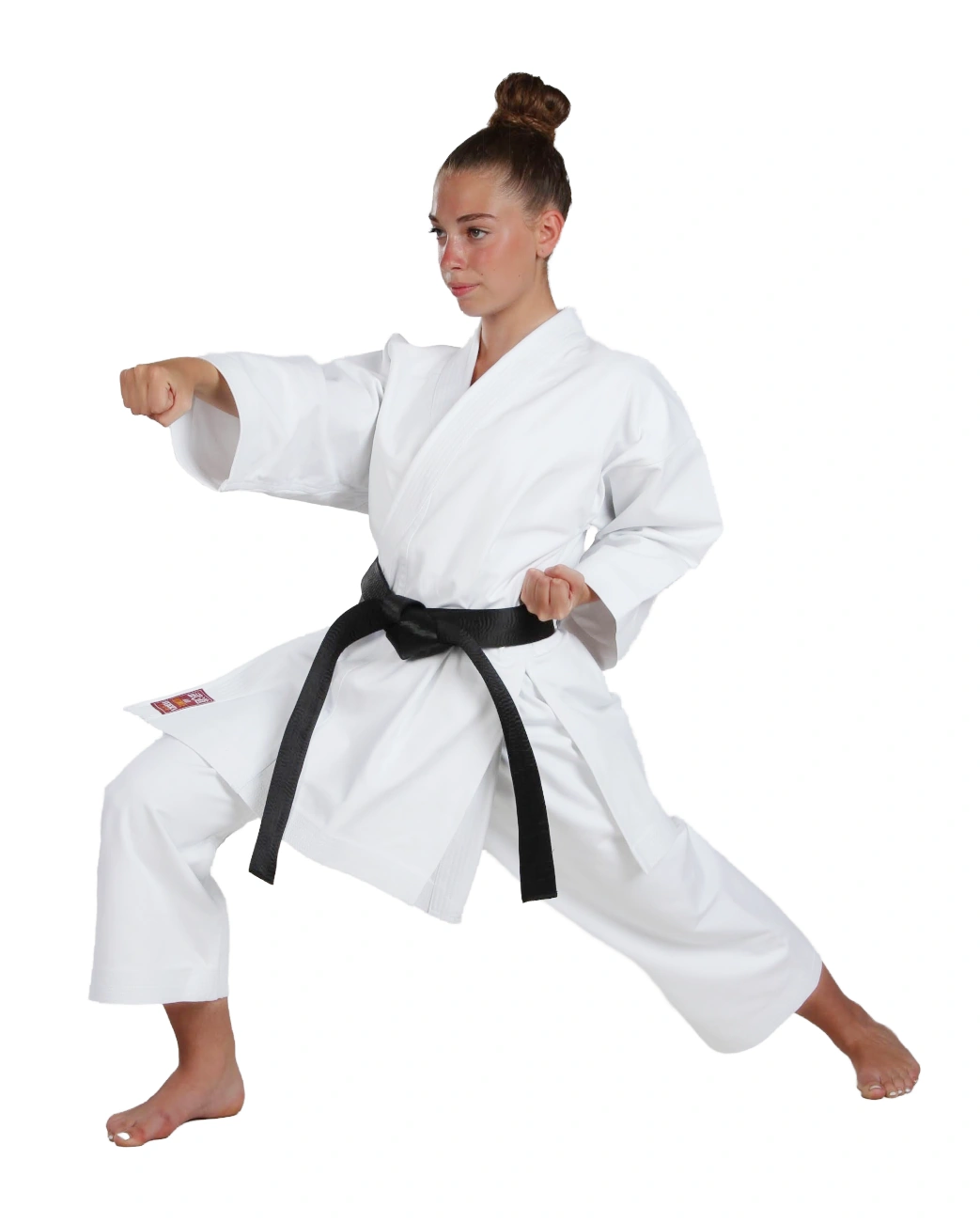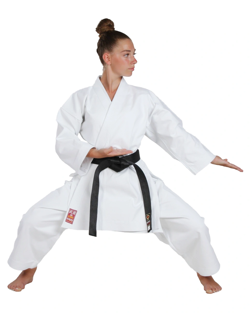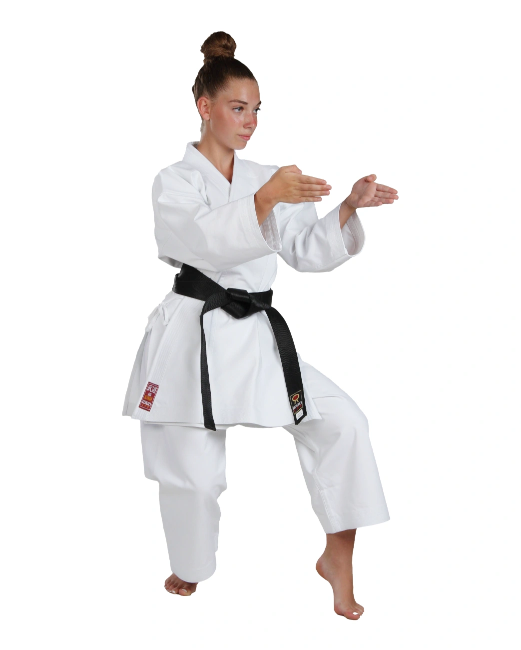 Taglio: Progettato specificamente per il kata, il taglio presenta maniche e pantaloni più corti rispetto ai karategi tradizionali. Il pantalone è dotato di un elastico largo 6 cm e un cordoncino interno. Il fondo della giacca, delle maniche e del pantalone è rifinito con 12 cuciture per garantire resistenza e durabilità.