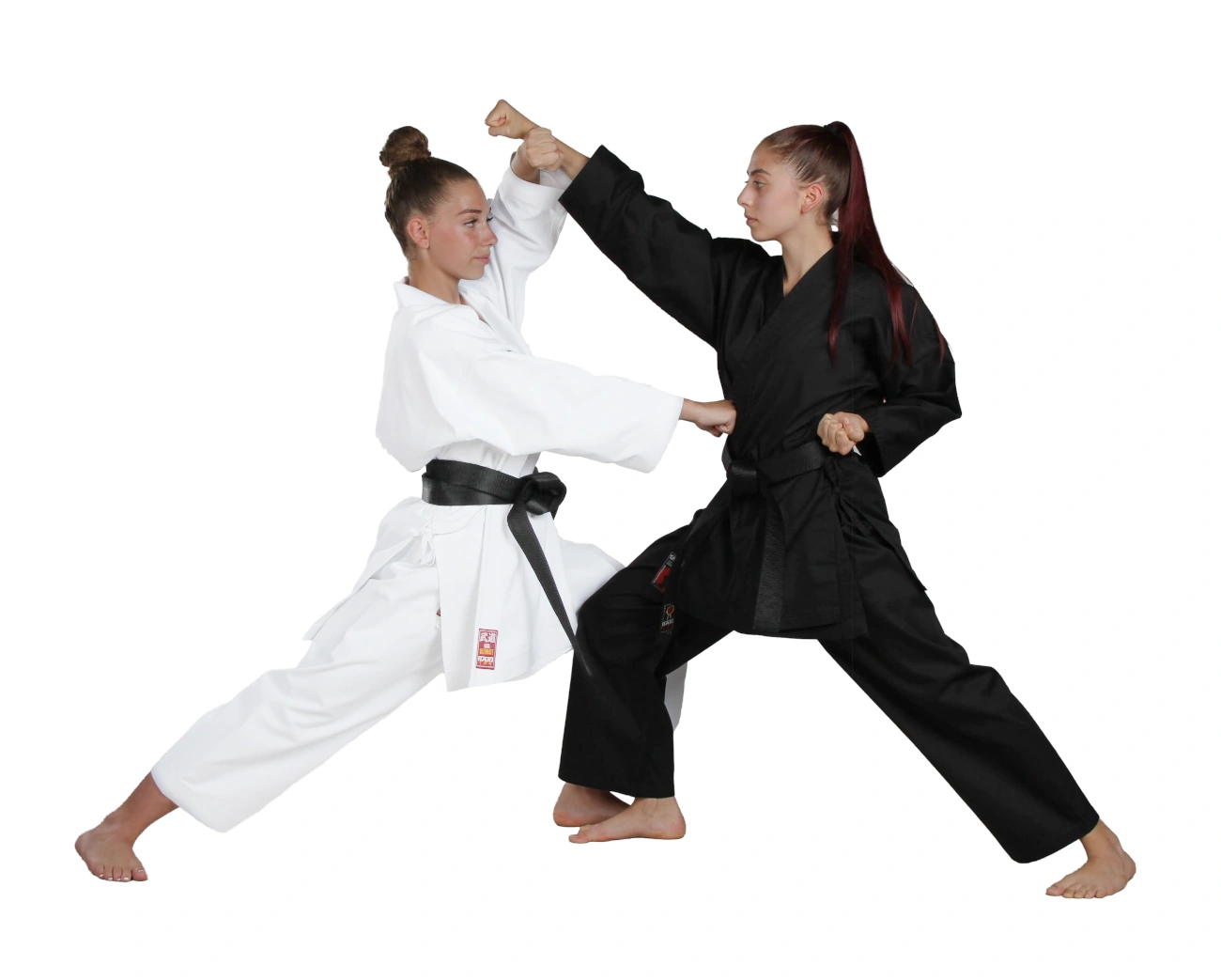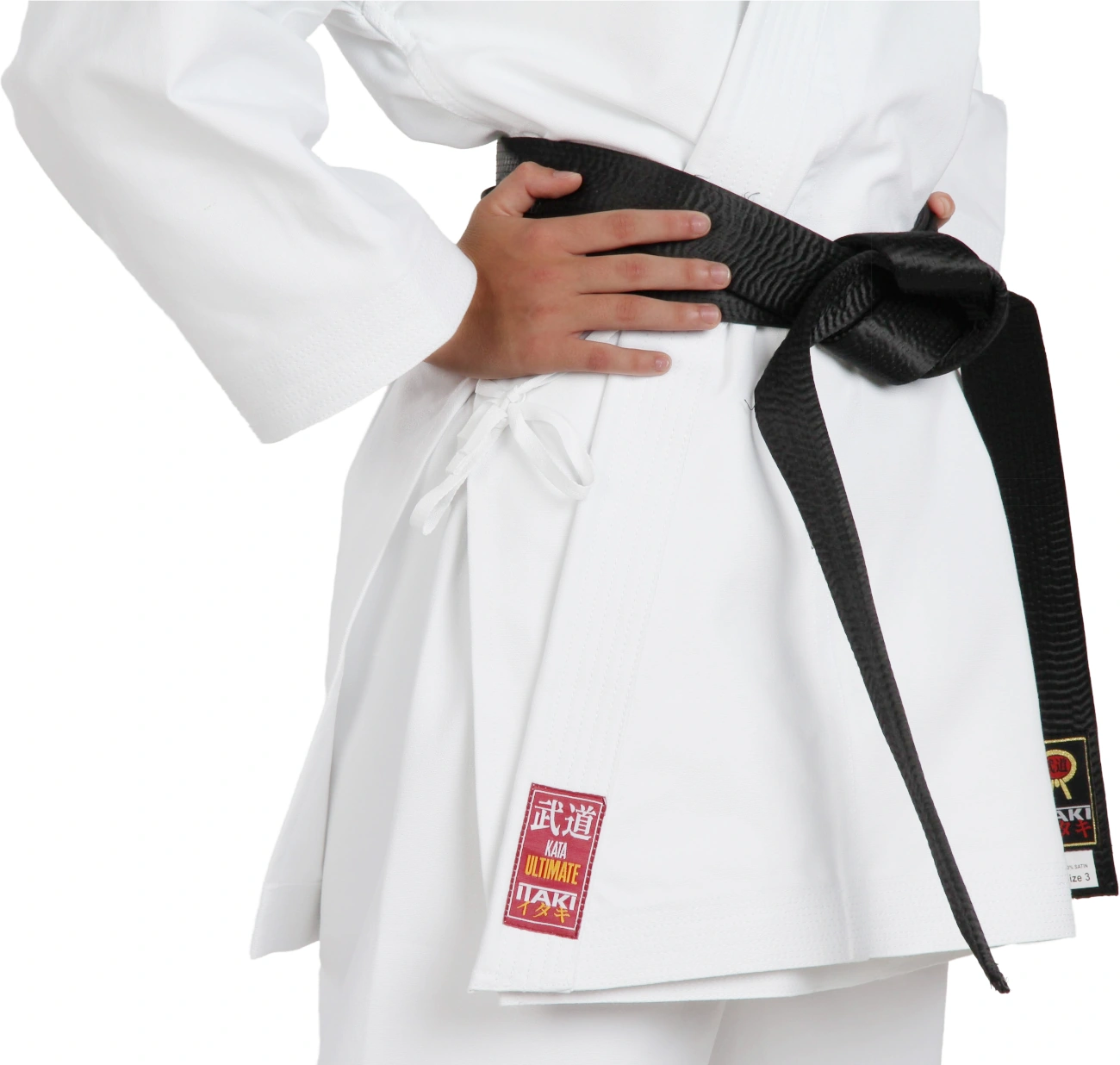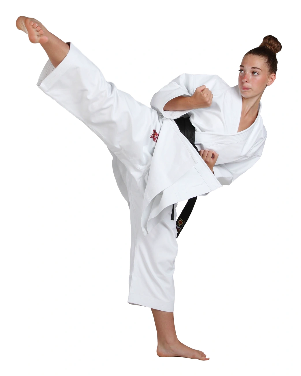 Taglio: Progettato specificamente per il kata, il taglio presenta maniche e pantaloni più corti rispetto ai karategi tradizionali. Il pantalone è dotato di un elastico largo 6 cm e un cordoncino interno. Il fondo della giacca, delle maniche e del pantalone è rifinito con 12 cuciture per garantire resistenza e durabilità.