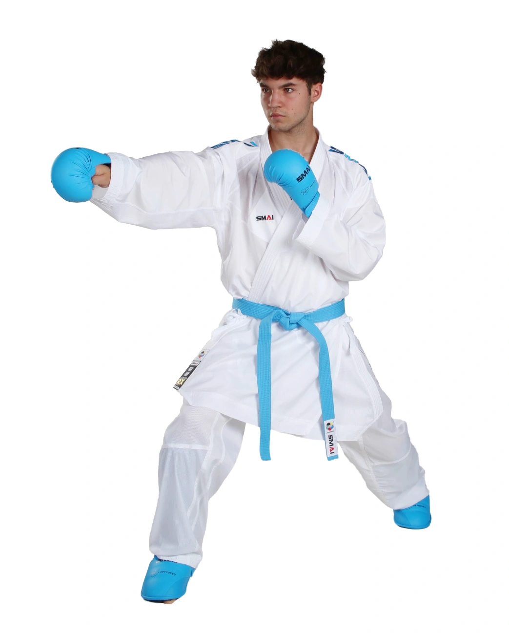 Ricami: Il karategi presenta il ricamo SMAI sul petto e sulla schiena sotto al colletto. Sul lato del pantalone è inoltre presente un ricamo del logo WKF, insieme al kanji Inazuma.