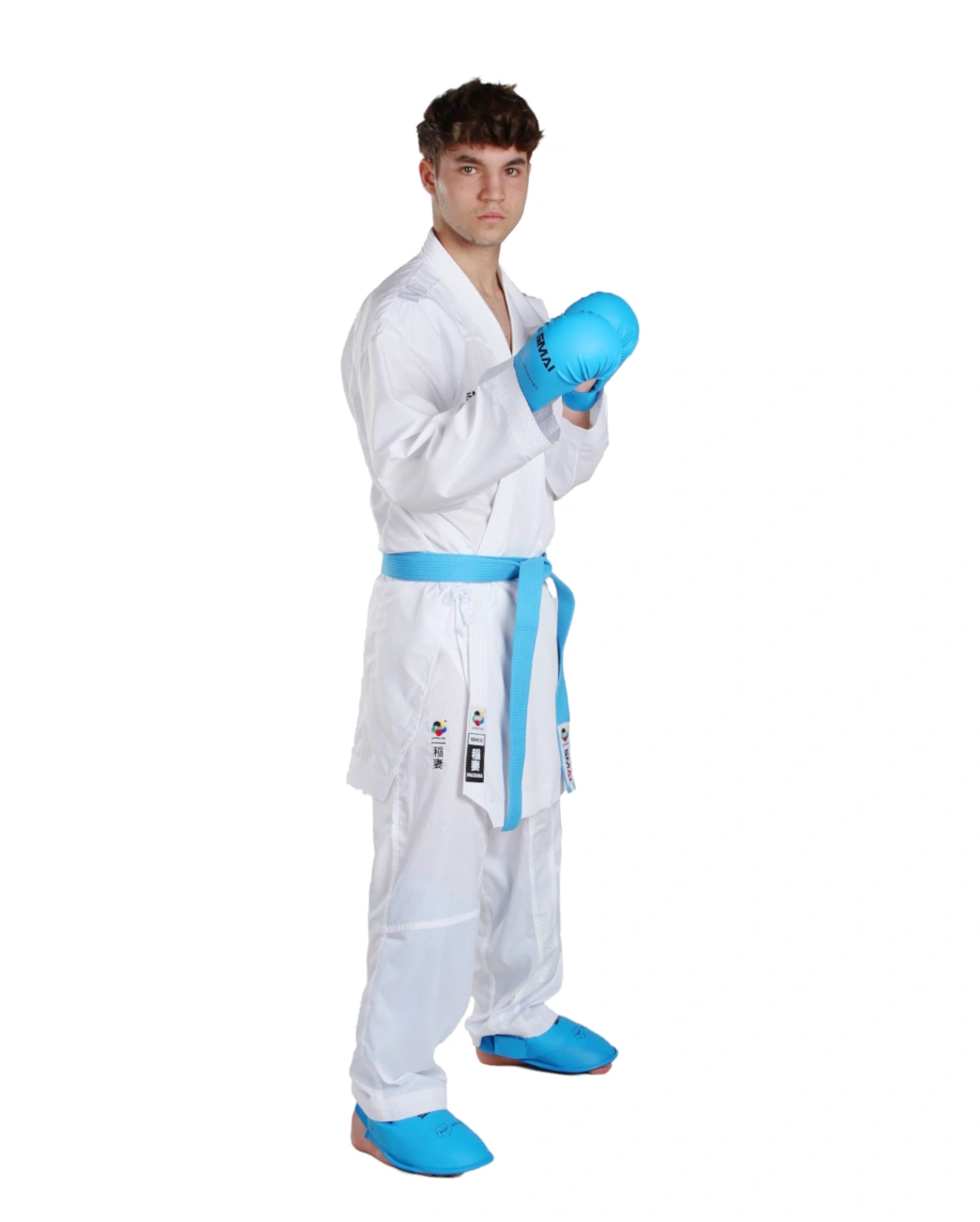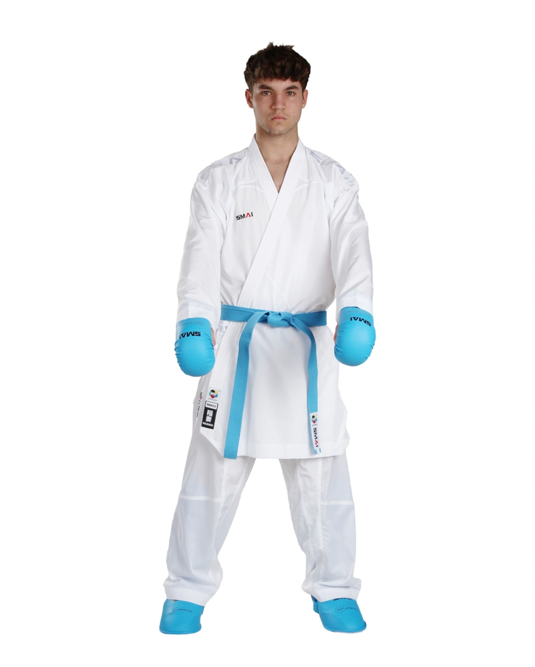 Ricami: Il karategi presenta il ricamo SMAI sul petto, sulla schiena, sotto al colletto e in bianco sulle spalle. Sul lato del pantalone è inoltre presente un ricamo del logo WKF, insieme al kanji Inazuma.