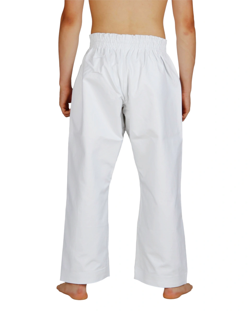 Il pantalone da karate con taglio tradizionale, in 100% cotone pesante, combina robustezza e comfort. Dotato di elastico rinforzato e bordo inferiore con 12 cuciture. Per allenamenti e competizioni.