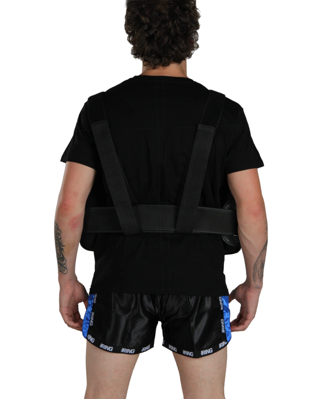 Fissaggio: Il fissaggio della protezione avviene tramite bande e velcro sulla schiena e a bretella. In questo modo, la protezione è fissata al corpo del maestro in modo stabile e sicuro, senza necessità di aggiustamenti.