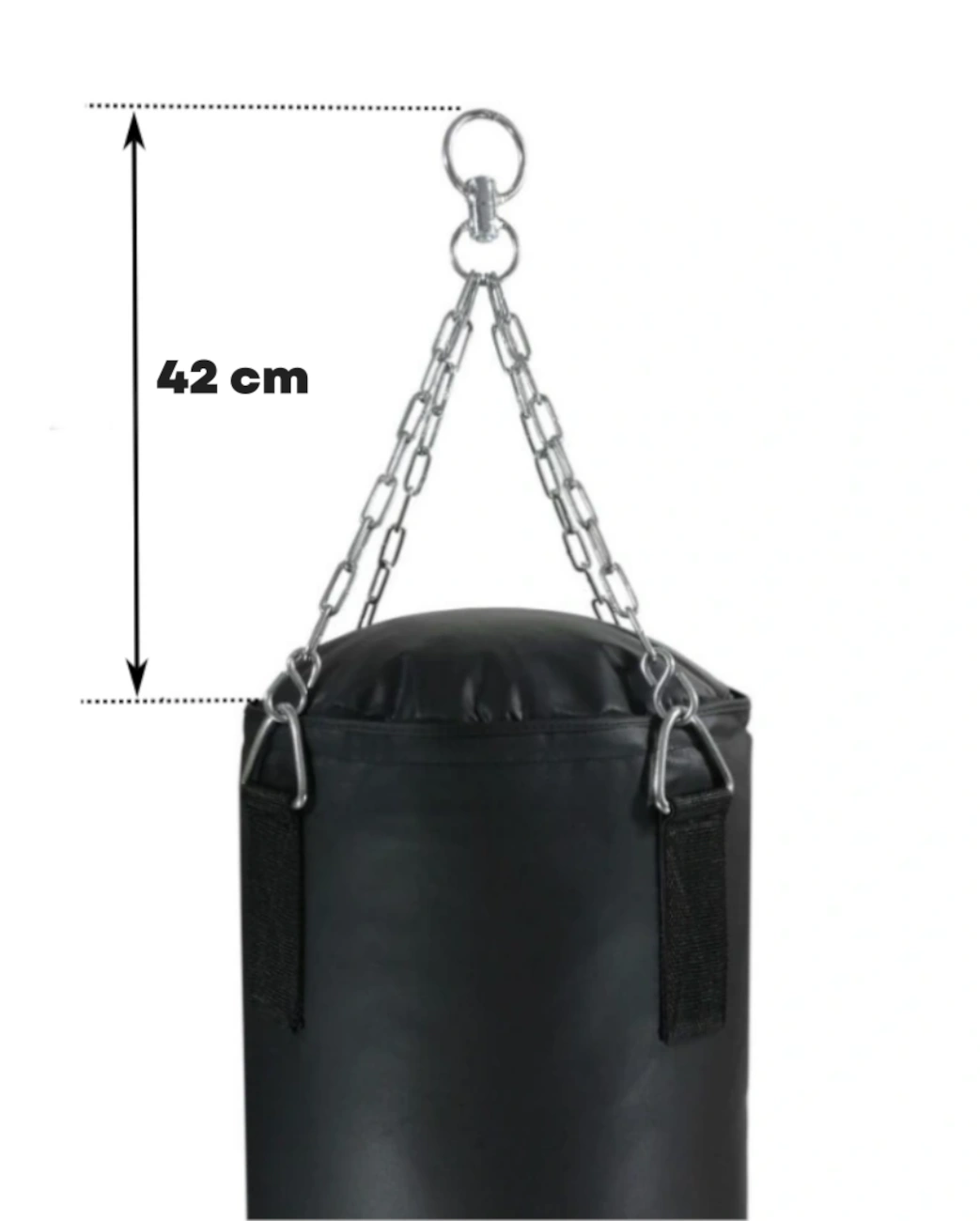 Sistema di aggancio: Il sacco è dotato di quattro catene e un anello per l’aggancio, con le catene fissate tramite robuste fettucce di nylon resistenti e con doppio rinforzo. Questo sistema di aggancio assicura stabilità e sicurezza durante gli allenamenti.