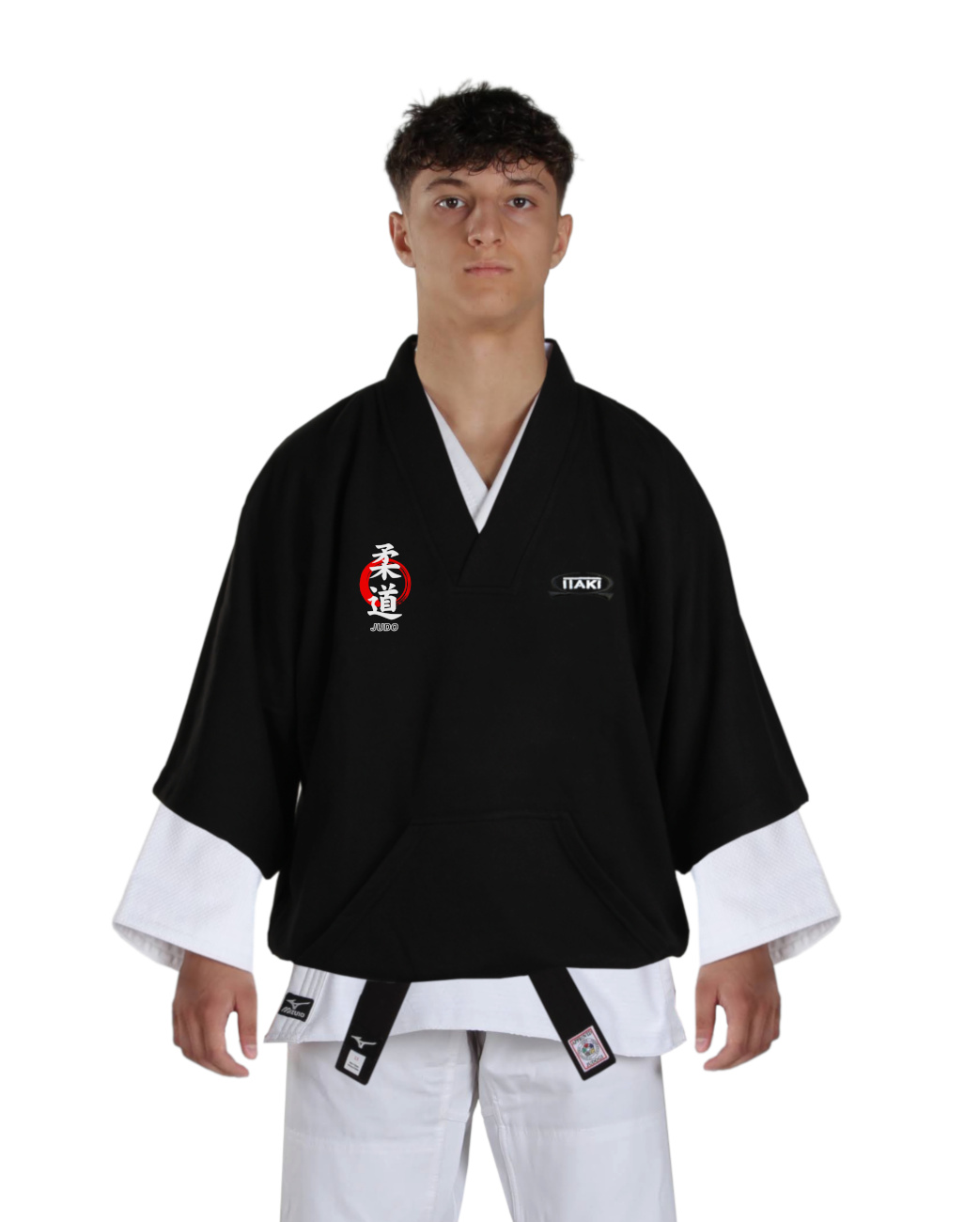 Coprikimono in stile giapponese Itaki, realizzato in morbida felpa nera. Ideale da indossare sopra il judogi o il karategi durante o dopo gli stage di arti marziali, ma perfetto anche per il tempo libero. Logo Itaki ricamato sul petto, stampa Judo Kanji sul petto e sulla schiena.