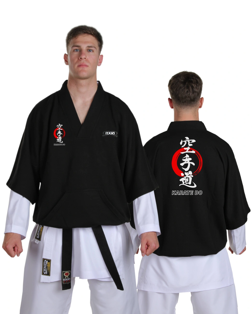 Coprikimono in stile giapponese Itaki, realizzato in morbida felpa nera. Ideale da indossare sopra il judogi o il karategi durante o dopo gli stage di arti marziali, ma perfetto anche per il tempo libero. Logo Itaki ricamato sul petto, stampa Karate Do con cerchio rosso sul petto e sulla schiena.