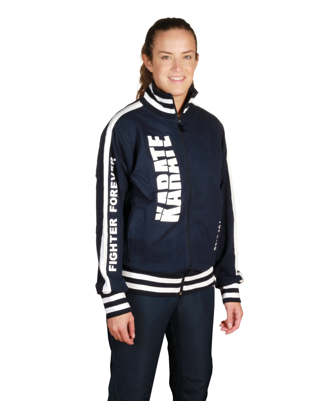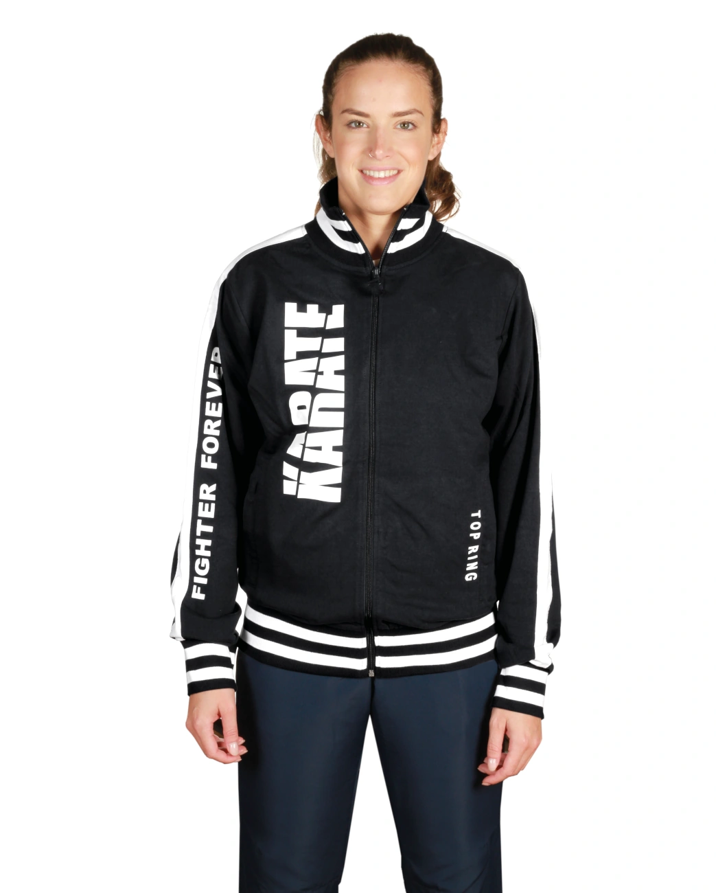 Felpa a maniche lunghe con cerniera, ideale per palestra e uso quotidiano. Stampa frontale “Karate” e motto “Fighter Forever” sulla manica, per uno stile sportivo dedicato agli amanti delle arti marziali.