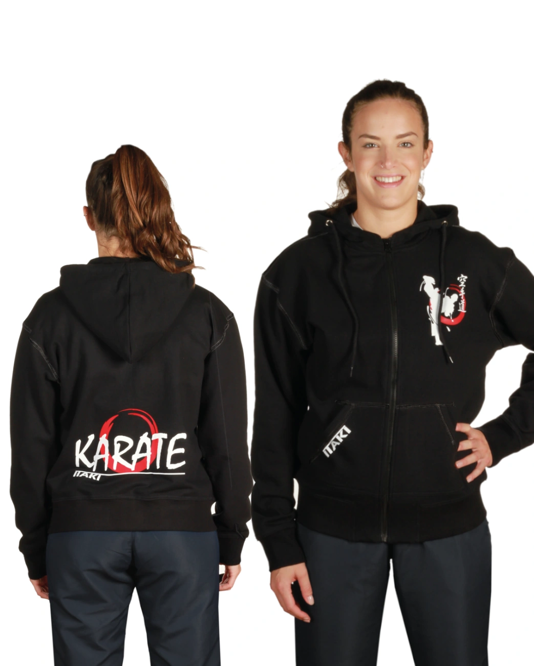 Stampa: La felpa presenta una grafica stampata sia sul davanti che sul retro. Sul davanti sono raffigurati un Karateka, mentre sul retro sono presenti la scritta Karate e un cerchio rosso.