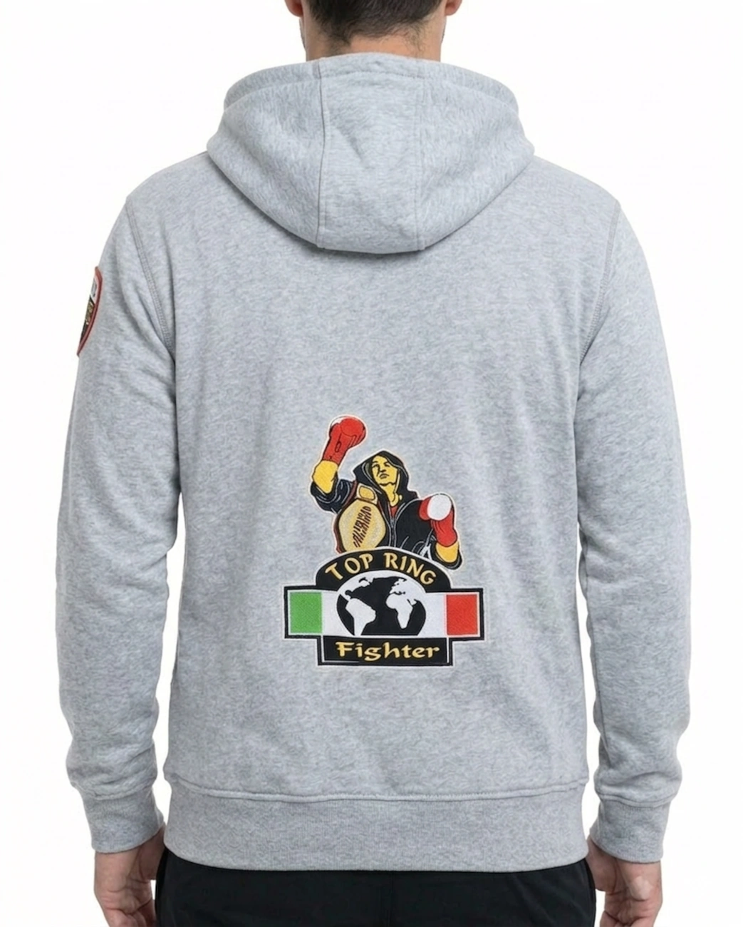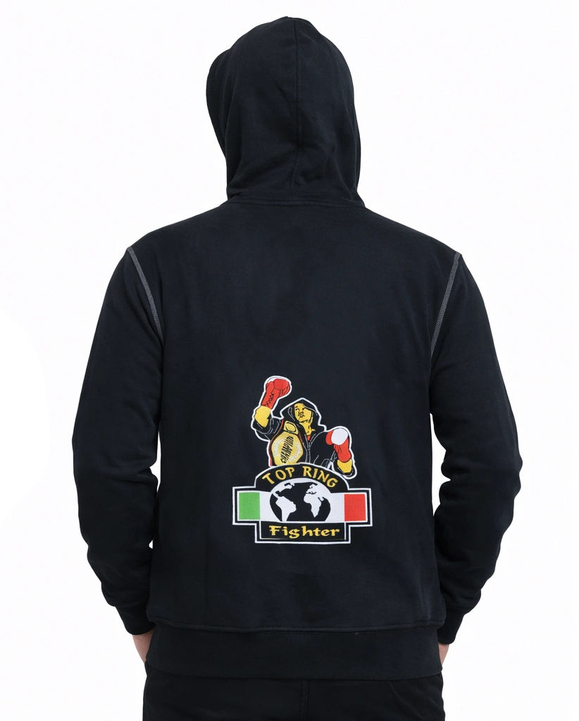 Colore: Il capo è disponibile nella colorazione grigio e nero. Sul retro spicca l’iconica e vivace grafica “TOP RING Fighter”, che raffigura un pugile vittorioso con la cintura mondiale, incorniciato dal tricolore italiano e dal mappamondo, simbolo di eccellenza globale negli sport da combattimento.