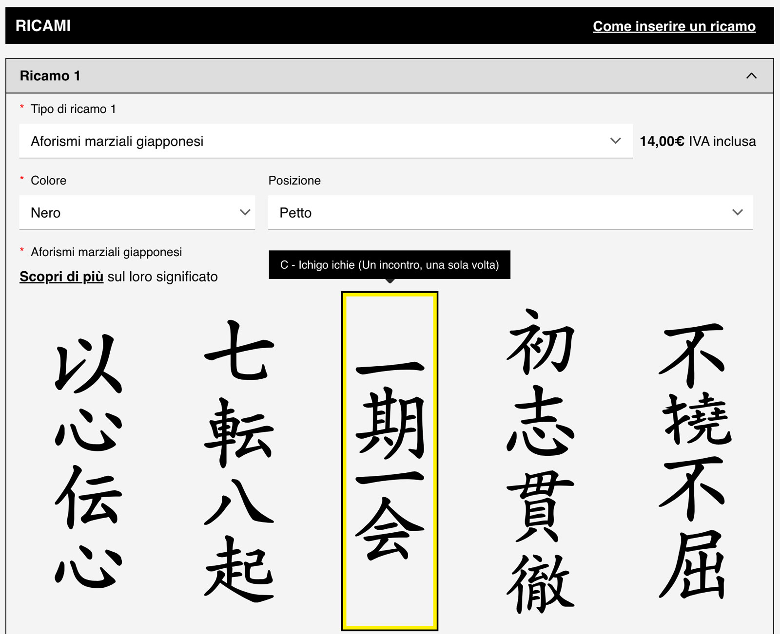 Sceglierli è semplice: entra nell’articolo che desideri ricamare, apri il menu dedicato al ricamo e seleziona “Aforismi marziali giapponesi”.